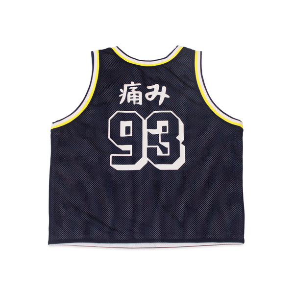 Mesh "Nation Jersey" with Woven Label at Lower Front. Double Layered and Reversible. Screenprinted on Both Sides.